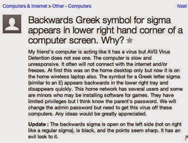 Το σύμβολο αυτό θα μπορούσε να ερμηνευθεί ως μια παραλλαγή του Ελληνικού "Ε" αφού όπως δήλωσε η γυναίκα ολόκληρη η οθόνη της συσκευής της είχε αντιστραφεί, το αριστερό τμήμα εμφανιζόταν δεξιά.