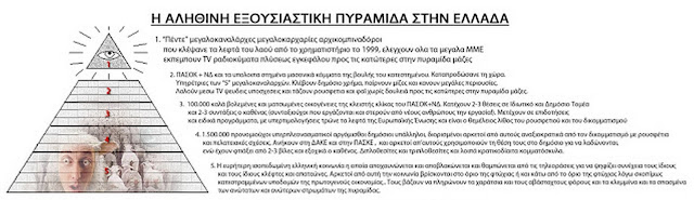 Στην παραπάνω φωτογραφία ο Βασίλης Λεβέντης παρουσιάζει τις πέντε βαθμίδες της εξουσίας στην Ελλάδα μέσα από μια μασονική πυραμίδα σύμφωνα με τα δικά του δεδομένα.