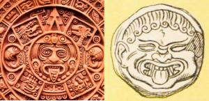 Αριστερά ένα τεχνούργημα των Αζτέκων, δεξιά αναπαράσταση από νόμισμα που βρέθηκε στην Νεάπολη (Καβάλα) και αναπαριστά την Μέδουσα. Οι ομοιότητες είναι φανερές...
