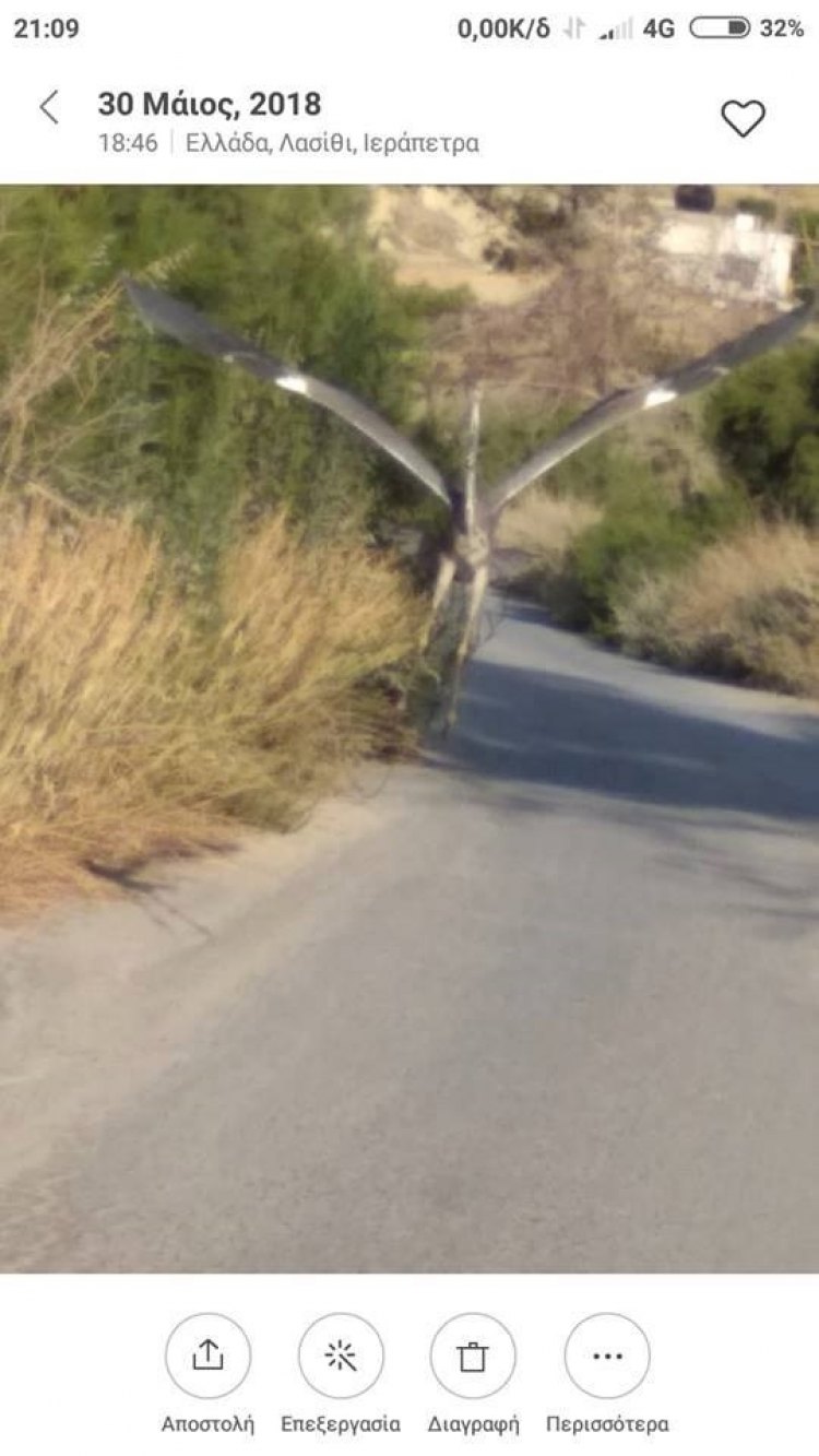 Το πτηνό μοιάζει με πτεροδάκτυλο και φωτογραφήθηκε από Γ. Νικολουδάκη ο οποίος το ανέβασε στη σελίδα ''ΜΕΤΕΟΚΡΗΤΕΣ''. Στη λεζάντα έγραψε: «πλάσμα που έμοιαζε με πουλί αλλά δεν ήταν κιόλας».Τα σχόλια έπεσαν βροχή ενώ ένας χρήστης ξεκαθάρισε ότι μάλλον επρόκειτο για ερωδιό, ο λεγόμενος και "σταχτοτσικνιάς" που ενδημεί στην περιοχή.
