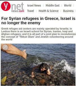 Ένα άρθρο στο Ynet News, το αγγλόφωνο ισραηλινό ειδησεογραφικό ιστότοπο της Yedioth Ahronoth, που είναι η πιο αναγνωρίσιμη εφημερίδα στο Ισραήλ, επιβεβαίωσε ότι “τα ελληνικά κέντρα βοήθειας για πρόσφυγες λειτουργούν κυρίως από ...Ισραηλινούς” και ότι στο νησί της Λέσβου, υπάρχει “ισραηλινό σχολείο για Σύριους, Ιρανούς, Ιρακινούς και Αφγανούς πρόσφυγες”.