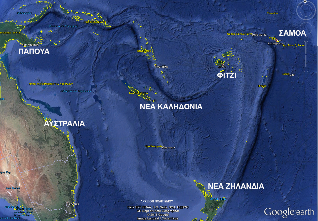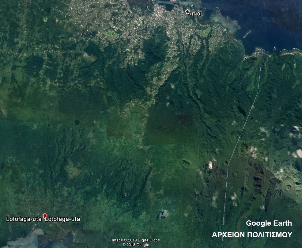 Όπως επίσης τι σχέση έχουν τα άλλα ελληνικά τοπωνύμια στα νησιά αυτά, όπως η πρωτεύουσα, που λέγεται… Απία, όπως λεγόταν η Πελοπόννησος, προ… Πέλοπος… κλπ. Στα νησιά του συμπλέγματος Απολίμα, Μανόνο, Σαβάιι, Ουπόλου, στα διαμερίσματα (Αάνα, Άτουα, κ.ά.) διακρίνονται σαφώς ελληνικές ετυμολογικές ρίζες…