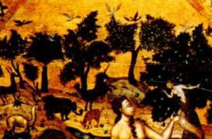 Προϊστορικά πουλιά, ένας μονόκερος, ένα λάμα και ο Σατανάς - Naga σε λεπτομέρεια ζωγραφικού πίνακα που απεικονίζει την πτώση των πρωτοπλάστων. Έργο του Καστροφύλακα 18ος αιώνας