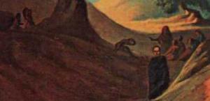 Η συγκεκριμένη λεπτομέρεια είναι από τον πίνακα του Claude Pinet "Ο χορός του Ζαλόγγου ή οι Σουλιώτισσες", λάδι σε καμβά 0,69 x 0,90 εκ. Αθήνα, Μουσείο Μπενάκη. Παράξενη σκηνή σε έναν ιστορικό πίνακα. Τι ήθελε να συμβολίσει ο ζωγράφος; Ποιος είναι ο μαυροφορεμένος άνθρωπος που η ενδυμασία του δεν έχει καμία σχέση ούτε με Ελληνική ούτε και με Τούρκικη φορεσιά ο οποίος παρακολουθεί τη σκηνή με απίστευτη ψυχρότητα; Ποιές είναι οι κοπέλες που απεικονίζονται πίσω του οι οποίες δεν φαίνονται να ανησυχούν από το παράξενο δίποδο πλάσμα που τις πλησιάζει απειλιτικά μιας και οι μεγαλύτερη γυναίκα φαίνεται να το κρατάει σε απόσταση με μια ήρεμη αποτρεπτική κίνηση του χεριού της; Και επίσης ποιες είναι οι άλλες τρεις γυναίκες πάνω αριστερά που φαίνονται να κοιτούν με ενδιαφέρον τη σκηνή; Η όλη σκηνή φαίνεται άκυρη με το θέμα της θυσίας των Σουλιωτών. Η φωτογραφία είναι από το περιοδικό Αρχαιολογία τεύχος 100 σελ. 22