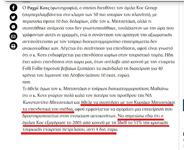 Τι ήθελε όμως τον κ. Μητσοτάκη ο τούρκος δισεκατομμυριούχος; Μαθαίνω ότι ο κ. Κοτς γνώριζε πολύ καλά τον πατέρα του προέδρου της ΝΔ Κωνσταντίνο Μητσοτάκη και ήθελε να συζητήσει με τον Κυριάκο Μητσοτάκη τα επενδυτικά του σχέδια, αφού εμφανίζεται να αγοράζει μια επιχείρηση που δραστηριοποιείται στην ενοικίαση αυτοκινήτων.