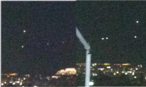 10 Απριλίου 2022. Αυτά θεάθηκαν ανάμεσα στο Λυκαβηττό και στον Υμηττό. Ήμουν στη βεράντα μου και τα παρατηρούσα για περίπου 15-20 λεπτά. Αρχικά νόμιζα πως ήταν προβολείς από τον Υμητό γιατί έχει εκεί κάτι δορυφορικές κεραίες στην κορυφογραμμή αλλά αυτά δεν ήταν στη κορυφογραμμή. Ήταν ακριβώς στο ύψος της Ακροπόλεως και του Λυκαβηττού δηλ. στη μέση του Υμηττού. οπότε προβολείς από αυτοκίνητα δεν ήταν. Ξαφνικά βλέπω αυτά τα φώτα που ήταν αμυδρά να γίνονται πιο έντονα και να πλησιάζουν προς εμένα και να ευθυγραμμίζονται με τα αλλα δύο που ήταν κάθετα και κάποια στιγμή λοιπόν αυτά, προσπάθησα να τραβήξω και βίντεο αλλά δεν έχω καλή κάμερα στο κινητό οπότε για τη φωτογραφία έκανα zoom για να καταλάβεις στη μία. Και βλέπω εκεί πέρα ότι αυτά που ήταν κάθετα μετακινήθηκαν πιο κοντά στα οριζόντια. Μετά από 10 λεπτά ίσως και λιγότερο το από πάνω από τα κάθετα έκανε μία κίνηση προς τα πάνω κατ' εμέ τουλάχιτον 100 μέτρα. Αυτά που ήταν κάθετα ήρθαν ακριβώσ δίπλα, κάθετα και εκείνα ε τα δύο προηγούμενα και αυτό που είχε ανέβει 100 μέτρα δίνσι μία και εκσφενδονίζεται προς το νότο, πέρασε δηλ. πάνω από τον Παρθενώνα και κατευθλυνθηκε προς Γλυφάδα. και το άλλο πήγε προς το βορά πήγε δηλ. προς την Πάρνηθα. Μετά από λίγο τα αλλα δύο που είχαν μελινει εκεί, τα ορθζόντα ας πούμε, και τα δύο αυτά μαζλι εκσφενδονιστήκανε και πήγανε προς τα πάνω.