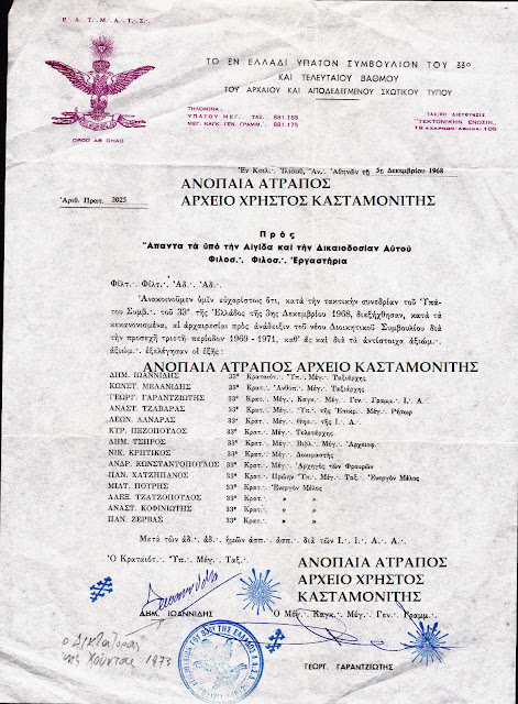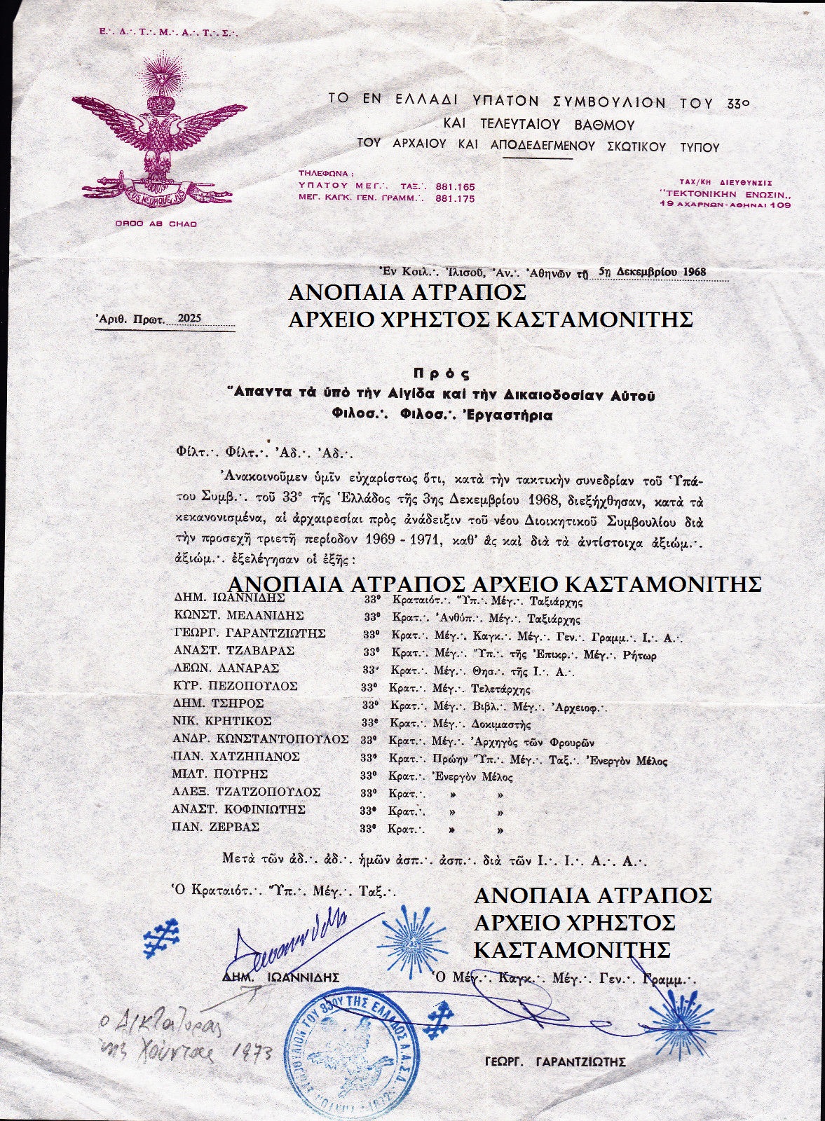ΔΕΙΤΕ ΤΗΝ ΥΠΟΓΡΑΦΗ ΤΟΥ ΔΗΜ. ΙΩΑΝΝΙΔΗ ΣΤΟ ΚΑΤΩ ΜΕΡΟΣ ΤΟΥ ΧΑΡΤΙΟΥ ΠΟΥ ΑΝΑΚΟΙΝΩΝΕΙ ΣΕ ΟΛΕΣ ΤΙΣ ΜΑΣΩΝΙΚΕΣ ΣΤΟΕΣ ΤΗΣ ΕΛΛΑΔΑΣ ΟΤΙ Ο ΜΕΤΕΠΕΙΤΑ ΔΙΚΤΑΤΟΡΑΣ ( 1973) ΚΑΙ ΑΡΧΙΚΟΣ ΠΡΩΤΕΡΓΑΤΗΣ ΜΑΖΙ ΜΕ ΠΑΠΑΔΟΠΟΥΛΟ ΚΑΙ ΠΑΤΑΚΟ ΤΗΣ ΧΟΥΝΤΑΣ ΤΟΥ 1967.