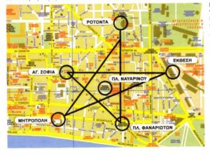 Αν μάλιστα αντικαταστήσουμε την πλατεία Φαναριωτών με το Λευκό Πύργο, όπου καταλήγει η οδός Παύλου Μελά, τότε η κάτω πλευρά του πενταγώνου, που σχηματίζεται από τη νοητή ευθεία που ενώνει τη Μητρόπολη με το Λευκό Πύργο,