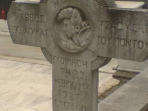 Μακάβρια αυτή την φορά η αναφορά και δεν ξέρω κατά πόσο μπορεί να θεωρηθεί περίεργη. Κοιτάξτε λίγο το χτένισμα του κεφαλιού. Δεν σας θυμίζει punk ή έστω ροκαμπιλά; Όμως punk το… 1927; Εκτός πάλι αν αυτό που φαίνεται σαν μαλλί είναι κάποιο είδος σκούφιας πράγμα το οποίο το υποστηρίζει και εκείνη η λοξή χαρακιά. Επίσης δεν μπόρεσα να καταλάβω τι κεφάλι είναι αυτό, Είναι άραγε του αποβιώσαντος ή ίσως κάποιου αγγέλου; Λέω αγγέλου γιατί εκείνη η καμπύλη κάτω από το αυτί μου θυμίζει σαν τις καμπύλες που βλέπουμε στα φτερά τους στις αγιογραφίες. Από την άλλη πάλι μου θυμίζει και τζάκετ. Επίσης στον ίδιο τάφο παρατήρησα πως είναι θαμμένος και κάποιος ιερέας ο οποίος απεβίωσε το 1962 και μάλιστα υπάρχει και η φωτογραφία του με ράσα. Ναι, τότε υπήρχαν ροκάδες αλλά είναι δυνατόν ένας ροκάς να γίνει στη συνέχεια ιερέας και μετά θάνατον να τον απεικονίσουν όπως ήταν στα νιάτα του; Χαζό μου φαίνεται. Επιπλέον δεν φαίνεται το σκάλισμα να έγινε πάνω στη πέτρα 35 χρόνια αργότερα. Ο τάφος βρίσκεται στο Αʼ Νεκροταφείο Δράμας.
