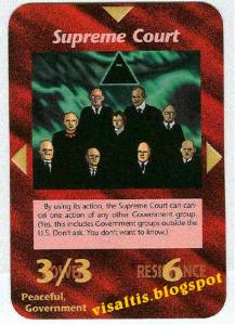Η συγκεκριμένη κάρτα που υπαινίσσεται την ύπαρξη ενός ανώτατου διευθυντηρίου το οποίο θα εναρμονίζεται απόλυτα με τους σκοπούς των Ιλλουμινάτι,αποκτά ιδιαίτερο ενδιαφέρον για την Ελλάδα,αφού η ομοιότητα του κάτω δεξιά μέλους του “Ανωτατου Δικαστηρίου” με τον σημερινό πρωθυπουργό της Ελλάδος Γ.Παπανδρέου,είναι εμφανής!Βέβαια η πιθανότητα σύμπτωσης είναι ομολογουμένος μεγάλη στην συγκεκριμένη περίπτωση.