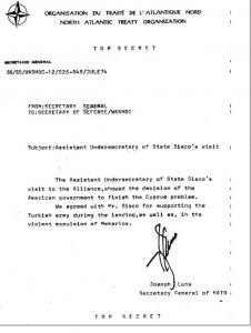 "... από την επίσκεψη του Υφ. Εξωτερικών κ.Cisco στην Συμμαχία, κατέδειξε την απόφαση της Κυβέρνησης των ΗΠΑ να τελειώσουν με το Κυπριακό πρόβλημα. Συμφωνήσαμε με τον κ. Cisco να βοηθήσουμε τις Τουρκικές Δυνάμεις κατά την διάρκεια της απόβασης, όπως επίσης και στην βίαιη ανατροπή του Μακαρίου. Josheph Luns"