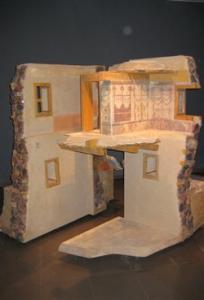 Στο ομοίωμα απεικονίζεται σε κλίμακα 1:4 η νοτιοδυτική γωνία της λεγόμενης ‘Δυτικής Οικίας’, ενός μάλλον τυπικού σπιτιού του κέντρου της πόλης. Στον άνω όροφο, όπου βρίσκονται οι χώροι κατοικίας, υπάρχει εγκατάσταση υγιεινής απομονωμένη από το υπόλοιπο σπίτι με πλινθότοιχο. Σε εσοχή του εξωτερικού τοίχου έχουν κτιστεί δύο πεζούλια, ύψους 0,43μ., ανάμεσα στα οποία υπάρχει κενό πλάτους 8-10εκ. Το κενό αντιστοιχεί σε οπή στο πάτωμα, η οποία αποτελεί το στόμιο αγωγού. O αγωγός, που απαρτίζεται από κατακόρυφους πήλινους σωλήνες εντοιχισμένους στη λιθοδομή του ισογείου, καταλήγει σ’ ένα άνοιγμα του τοίχου προς την εξωτερική πλευρά του κτηρίου. Aπό το άνοιγμα αυτό, τα απόβλητα χύνονταν σε φρεάτιο το οποίο συνδέεται με το κεντρικό δίκτυο του οικισμού. Το "φρεάτιο επισκέψεως" για τον καθαρισμό και την συντήρηση των εγκαταστάσεων, λειτουργεί επίσης ως σημείο αλλαγής στάθμης και κατεύθυνσης του κεντρικού δικτύου.