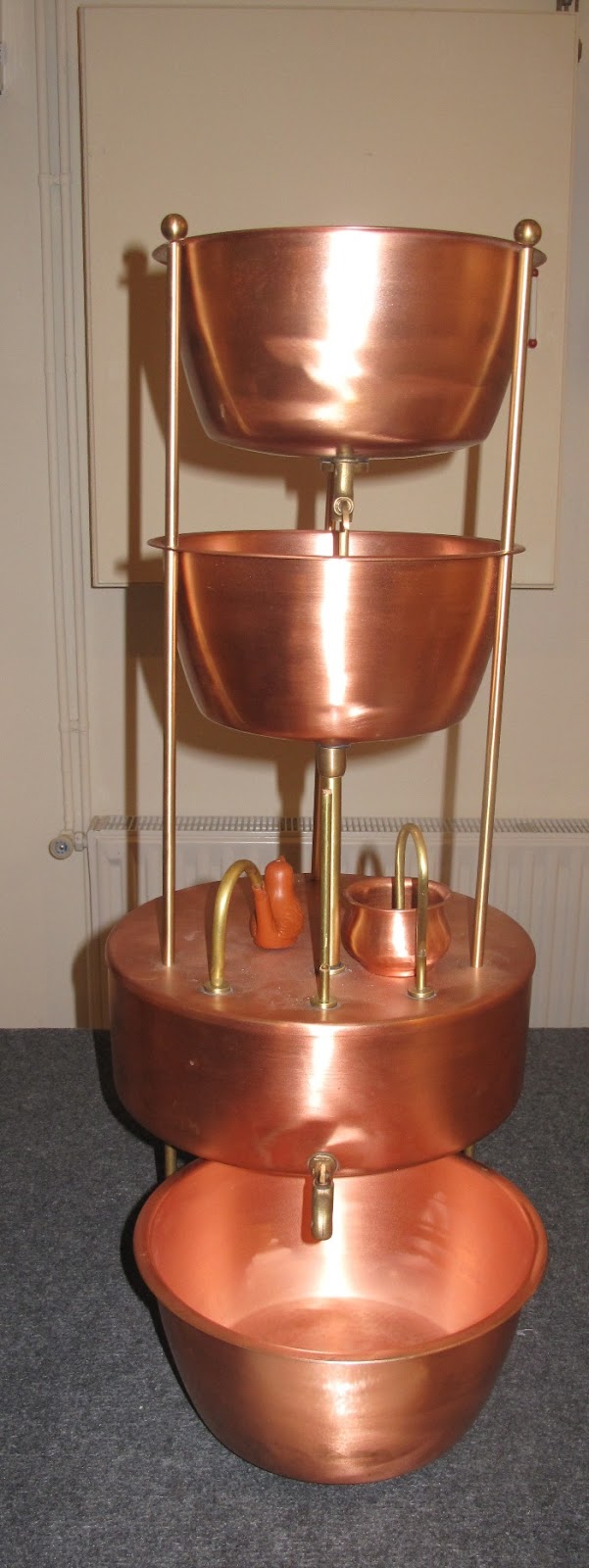Το ανώτερο κεραμικό δοχείο τροφοδοτεί μέσω (κατάλληλα υπολογισμένου για την κάθε περίπτωση) ακροφυσίου το επόμενο δοχείο. Όταν αυτό γεμίσει την προγραμματισμένη χρονική στιγμή (π.χ. μετά από 7 ώρες) αδειάζει με ταχύτητα μέσω του εσωτερικά τοποθετημένου αξονικού σιφωνίου στο επόμενο κλειστό δοχείο και αναγκάζει τον εμπεριεχόμενο αέρα να εξέλθει με πίεση σφυρίζοντας από μία σύριγγα στην κορυφή του.