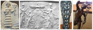 Αριστερά η Σουμεριακή θεά Ιστάρ με ένα ραβδί από δύο περιστρεφόμενα φίδια. Κέντρο αριστερά, Σουμεριακή κυλινδρική σφραγίδα η οποία δείχνει έναν ηλιακό δίσκο πάνω από δύο φίδια. Κέμτρο δεξιά, ο Σουμεριακός θεός Νινγκιζίντα εμφανιζόμενος καθώς δύο φίδια περιστρέφονται γύρω από έναν κεντρικό στύλο όπως απεικονίζεται σε ένα σουμεριακό βάζο (χρονολογείται μεταξύ 2200-2025 π.Χ.). Δεξιά ο θεός Ερμής φορώντας ένα φτερωτό καπέλο και κρατώντας το κυρήκειο.