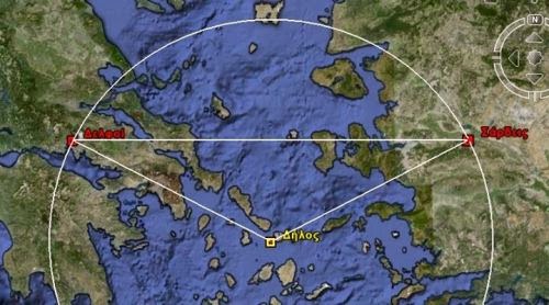 ΣΥΝΔΕΣΙΣ ΜΕ ΤΟ ΣΥΝΠΑΝΜελετώντας λοιπόν τις ευθυγραμμίσεις των Ελληνικών Ναών….αλλά κυρίως τους γεωμετρικούς σχηματισμούς που σχηματίζονται όπως: τρίγωνα, τόξα και σπείρες να σχηματίζονται εκ των θέσεων του χωροδικτυώματος των Ναών του Ελλαδικού τόπου και χώρου βλέπουμε κάποιους μεσημβρινούς και ευθυγραμμίσεις με ιδιαίτερη και ανάλογη σημασία που χρήζουν ασφαλώς περαιτέρω μελέτης και έρευνας. Η νοητή γραμμή ΔΕΛΦΟΙ-ΔΗΛΟΣ περνάει ακριβώς από την πρωτεύουσα Αθήνα. Γι’ αυτό και στους Δελφούς υπάρχει ο θόλος της Αθηνάς Προναίας και αυτή η νοητή γραμμή ερμηνεύεται ως η ημερήσια πορεία του Ήλιου… Συνεχίζοντας και διαβάζοντας τον Ομηρικό ύμνο εις τον Απόλλωνα προκύπτει το συμπέρασμα ότι όχι μόνον υπάρχει ένας άλυτος δεσμός εις τον θεό Απόλλωνα μεταξύ των ναών της Κνωσού και της ιερής Πυθόνας (Δελφοί), αλλά από τα πανάρχαια χρόνια στον ναό του Απόλλωνος υπηρετούσαν οι Κρήτες ιερείς, δηλαδή οι γνωστοί Κουρήτες. Η γραμμή λοιπόν ( Δελφοί-Κόρινθος ) ή αλλιώς Παρνησσός-Ακροκόρινθος καθορίζει μία κατεύθυνση παράλληλη στον ορεινό όγκο της Πίνδου και στην γραμμή που ενώνει την πόλη των Πατρών με το ακρωτήρι του Μαλέα. Το πρωταρχικό γενεσιουργό κέντρο όμως είναι η κορυφή της Ίδης και το άντρο αυτής, το Ιδαίον Άντρον….που είναι και το λίκνο του Διός. Έτσι η διεύθυνση ( Ίδη-Κόρινθος-Δελφοί ), αποτελεί την ραχοκοκαλιά του Ελληνικού χώρου και τόπου και σχηματίζει ακριβώς την παράλληλο με γωνία 60ο …που αποτελεί δηλαδή την προβολή της….σε τμήμα της επιφάνειας της σφαίρας (αν την δούμε ως επίπεδη) του κοσμικού άξονα Λέοντος-Υδροχόου, που σχηματίζει την ίδια γωνία με την γραμμή των ισημεριών. Στην ουσία δηλαδή….ομιλούμε για την εποχή του Υδροχόου καθώς είναι γνωστόν ότι ανά εποχή έχουμε και τις ανάλογες αντιστοιχίες που είναι οι εξής…..έχοντας πάντα κατά νου ότι το 10.800 π.Χ. θεωρείται από τους Αιγυπτίους η αρχή της εποχής του Λέοντα δηλαδή….(ανατολή του Βασιλίσκου (Regulus) ή α' του Λέοντα). Έτσι αντίστοιχα κατά προσέγγιση έχουμε τις περιόδους: Την περίοδο του Αιγόκερω : (21.550π.Χ. – 19.400π.Χ.)-Ισημερίες: Καρκίνος, Αιγόκερω.-Ηλιοστάσια : Ζυγός, Κριός. Την περίοδο του Τοξότη (19.400π.Χ. – 17.250π.Χ.)-Ισημερίες: Τοξότης, Δίδυμοι-Ηλιοστάσια : Παρθένος, Ιχθείς. Την περίοδο του Σκορπιού (17.250π.Χ. – 15.100π.Χ.)-Ισημερίες: Σκορπιός ,Ταύρος-Ηλιοστάσια : Λέων, Υδροχόος. Την περίοδο του Ζυγού (15.100π.Χ. – 12.950π.Χ.)-Ισημερίες: Ζυγός, Κριός-Ηλιοστάσια : Καρκίνος, Αιγόκερω. Την περίοδο της Παρθένου (12.950π.Χ. – 10.800π.Χ.)-Ισημερίες: Παρθένος, Ιχθείς-Ηλιοστάσια : Δίδυμοι, Τοξότης. Την περίοδο του Λέοντα (10.800π.Χ. – 8.650 π.Χ.)-Ισημερίες: Λέων, Υδροχόος-Ηλιοστάσια : Σκορπιός, Ταύρος. Την περίοδο του Καρκίνου (8.650π.Χ. – 6.500 π.Χ. )-Ισημερίες: Καρκίνος, Αιγόκερω-Ηλιοστάσια : Ζυγός, Κριός. Την περίοδο των Διδύμων (6.500π.Χ. – 4.350 π.Χ.)-Ισημερίες: Δίδυμοι, Τοξότης-Ηλιοστάσια : Παρθένος, Ιχθείς. Την περίοδο του Ταύρου (4.350π.Χ. – 2.200 π.Χ.)-Ισημερίες: Ταύρος, Σκορπιός-Ηλιοστάσια : Λέων, Υδροχόος. Την περίοδο του Κριού (2.200π.Χ. – 50 π.Χ.)-Ισημερίες: Κριός, Ζυγός-Ηλιοστάσια : Καρκίνος, Αιγόκερω. Την περίοδο των Ιχθύων (50 – 2100 μ.Χ.)-Ισημερίες: Ιχθείς, Παρθένος-Ηλιοστάσια : Δίδυμοι, Τοξότης. Την περίοδο του Υδροχόου (2.100μ.Χ. – 4.250 μ.Χ)-Ισημερίες: Υδροχόος, Λέων-Ηλιοστάσια : Ταύρος, Σκορπιός. Έτσι έχουμε έναν πλήρη ζωδιακόν κύκλον. Φυσικά ο τελευταίος…..άξονας του Υδροχόου….σηματοδοτεί και σημαδεύει την Ελλάδα μεταβάλλοντάς την σε αναπαράσταση της Ουράνι