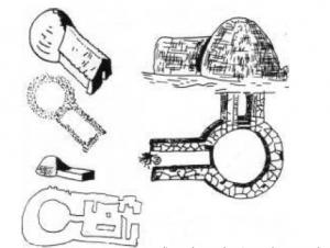 Άνω άριστερά: Αναπαράσταση καί σχεδιάγραμμα ενός ναού σε σχήμα «θόλου». Πολιτισμός Χάλαφ (Αρπα κιγιάχ, βόρειο Ιράκ). Κάτω αριστερά: 'Αναπαράσταση και σχεδιάγραμμα ενός αρχαίου ναού στη Μεσαρά (Κρήτη), σε σχήμα «θόλου» χρονολογείται από το έτος 2000 π.Χ. Δεξιά: Πλάγια όψη και σχεδιάγραμμα Ινδικού άτμόλουτρου. Άξιοπρόσεκτη ή εκπληκτική συγγένεια που υπάρχει ανάμεσα στα διάφορα τούτα θολωτά κτίσματα.