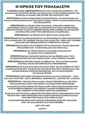 Είναι αργά το απόγευμα και στα γραφεία της «Ελλήνων Συνέλευσις» υπάρχουν λιγοστά μέλη. Ήρθε η ώρα να δώσω τον «Όρκο του Πολεμιστή» με τον οποίο κάποιος εντάσσεται στον σκληρό πυρήνα των ορκισμένων μελών της οργάνωσης.