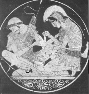 'Ο 'Αχιλλέας έπιδένει τήν πληγή του Πατρόκλου. Χρησιμοποιεί τήν τεχνική «σταχυοειδής περίδεσις τραύματος μέ δύο έπιδέσμους». 'Ελάχιστοι σημερινοί χειρουργοί είναι είς θέσιν νά κάνουν μία τόσο δύσκολη περίδεση.