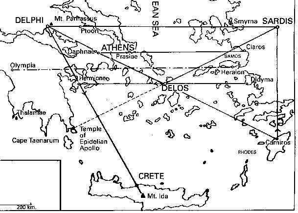 Στην ιερή μας γεωμετρία, η γραμμική ένωση των πόλεων με τους Αρτεμίσιους ναούς της Βραυρώνας – Αθήνας - Αυλίδας με γωνία 120 μοιρών έχει διχοτόμο που περνά από τον Ραμνούντα που βρίσκεται στην Αττική όπου υπάρχει ναός της Νεμέσεως και της Θέμιδος, θεότητες της δικαιοσύνης. Ο κύκλος που ξεκινά από την Αυλίδα τελειώνει στη Βραυρώνα με βραχίονα Ζυγού της Δικαιοσύνης στο Ραμνούντα. Η προέκταση της γραμμής της Βραυρώνας περνάει από την Αρκαδία (Άρκτος). Ακόμα υπάρχει το τρίγωνο λατρείας της Θεάς του Άργους – Αυλίδας – Βραυρώνας, ο οποίος εξυπηρετεί άλλες ευθυγραμμίσεις. Κατά κύριο λόγο τα ιερά της Αρτέμιδος με αυτά του Απόλλωνα και του Δία ή άλλων θεοτήτων με τη φορά κατεύθυνσής τους όσον αφορά τα τέσσερα σημεία του ορίζοντα θα αντιγράφουν προς – ευχήν τις κατευθύνσεις των ουρανίων σωμάτων, με απόλυτη μαθηματική ακρίβεια.