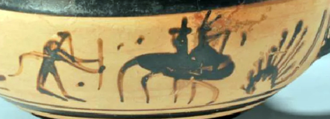 Εάν «απεικονίζεται ένας ιππέας και ο συνοδός του», τότε ο αρχαίος ζωγράφος ήταν πολύ κακός, κάκιστος… Αλλά μάλλον δεν εικονίζεται κάτι τέτοιο, αλλά ένα παράξενο «άρμα» (κάτι σαν «τεθωρακισμένο», κάτι σαν τον Δούρειο Ίππο), με το οποίο κάποιοι επιβαίνοντες πηγαίνουν να σκοτώσουν έναν δράκο (δεξιά), διπλωμένο σαν κάμπια… Το «άρμα» φαίνεται να «οδηγείται» εκ του μακρόθεν, από κάποιον άλλον άνδρα, που φέρει ουρά, που στέκεται πίσω του…